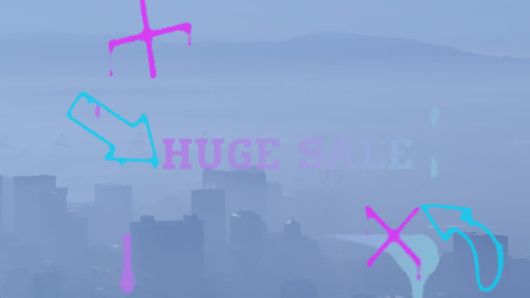 Urban cityscape with animated text celebrates a huge sale. Aimed at promotional and marketing materials guiding focus on discounts or offers. Useful for advertisements, online promotions, or announcements related to retail and sales events. Can emphasize exciting offers using vibrant, eye-catching style that draws audiences interested in urban events or retail promotions.