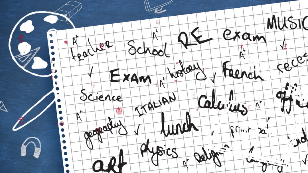 - Animated School Supplies with Handwritten Words on Gridded Paper