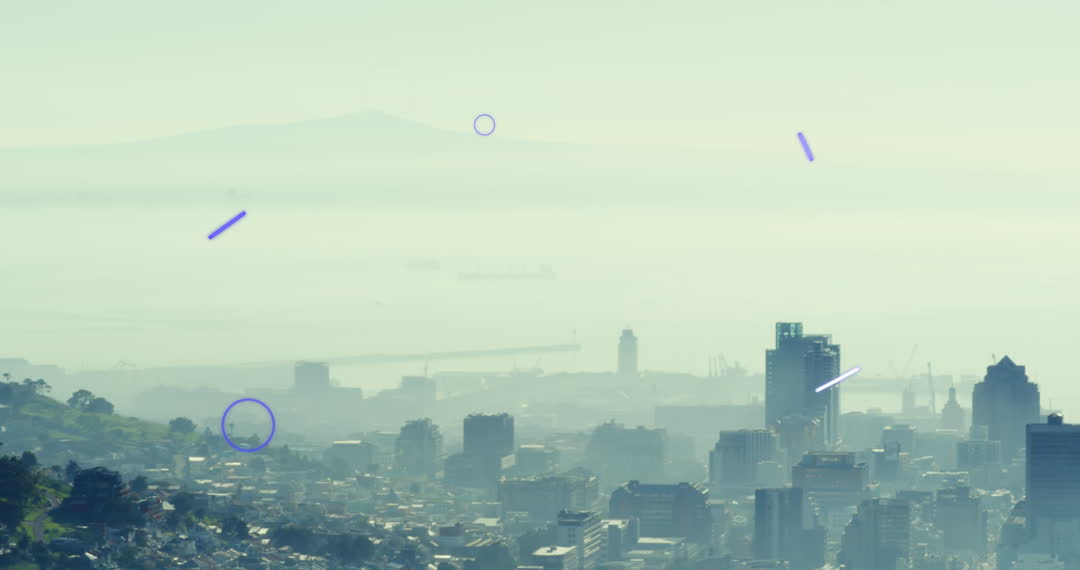 A dynamic visualization of scope elements with purple trails moving over a city backdrop, reflecting themes of technology and data processing. Useful for illustrating topics like cloud computing, modern technology, virtual surveillance, or digital transformation. Perfect for presentations, video backgrounds, and educational content related to smart cities.