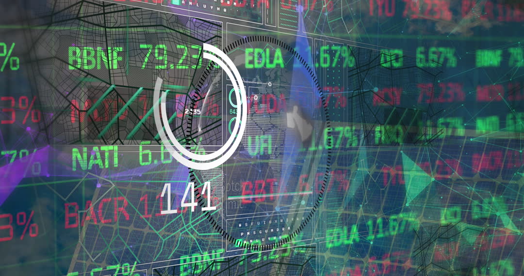 This visual captures the interplay between digital security and global financial markets, featured through an animation of a lock superimposed over fluctuating stock data. Suitable for illustrating themes related to cybersecurity in finance, technological impacts on stock trading, and secure investments. Useful as a visual asset for presentations or articles on financial technology, online trading platforms, and security protocols in business finance.