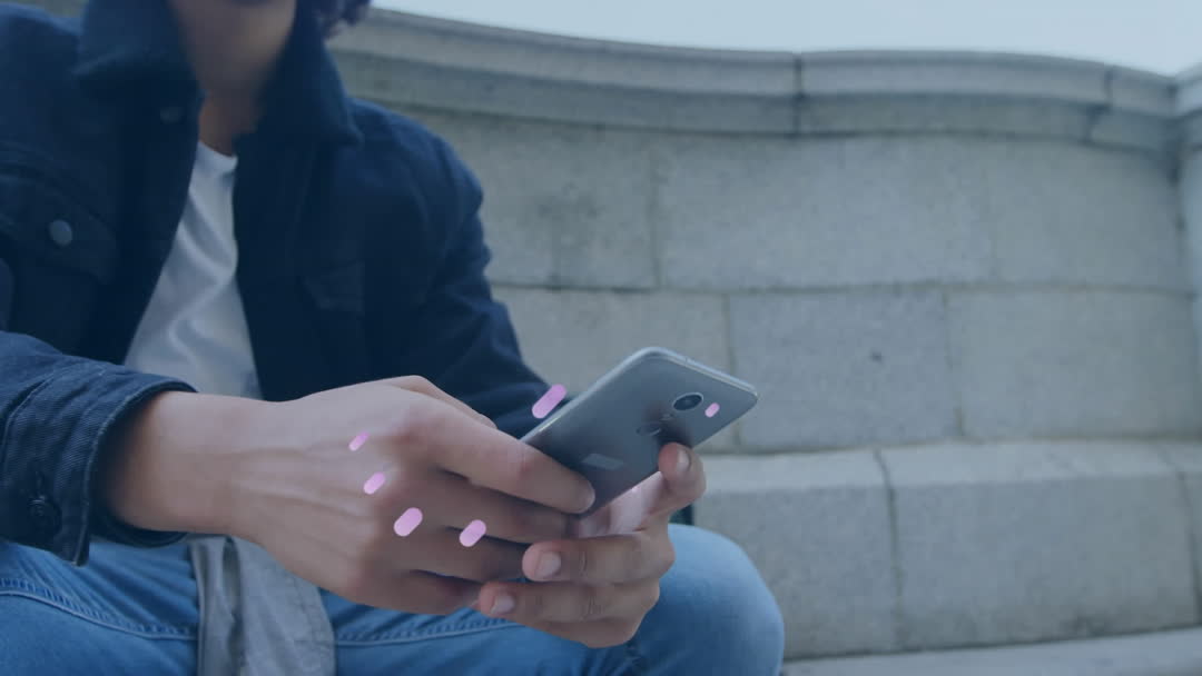 Man seated outdoors engaging with smartphone. Pink animated shapes overlaid for artistic effort in technology scenes. Ideal for promoting digital platforms, highlighting technology's role in contemporary lifestyle, or representing creativity and connectivity in media.