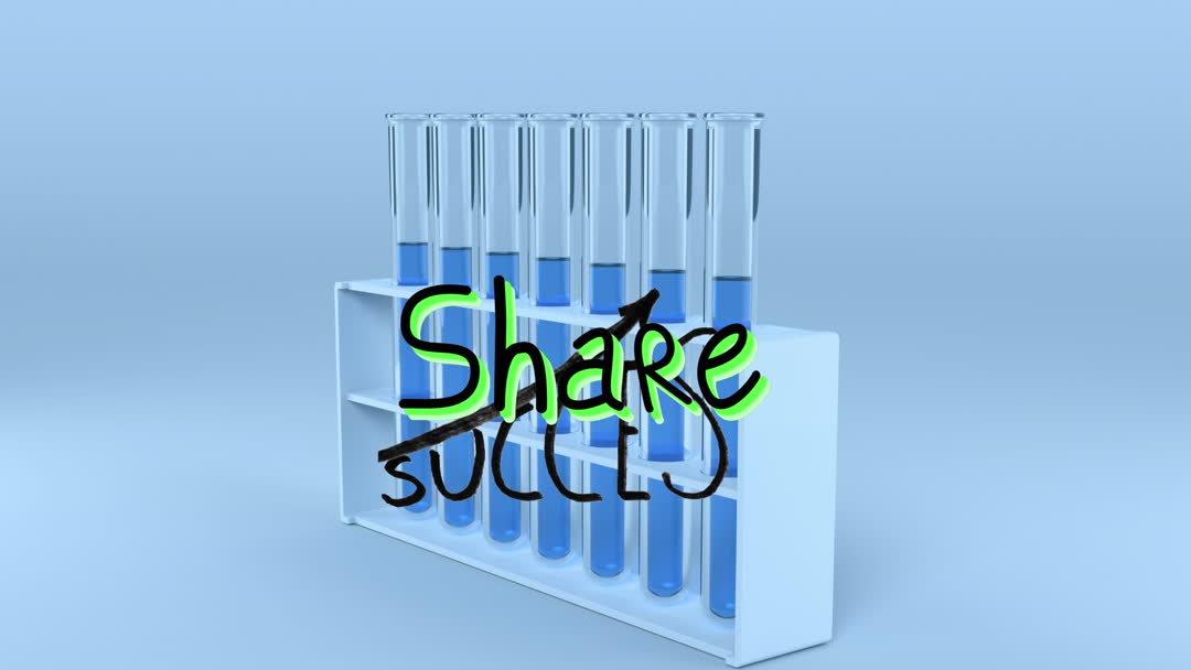 Animated 'Share' Text Appearing Over Test Tubes Video
