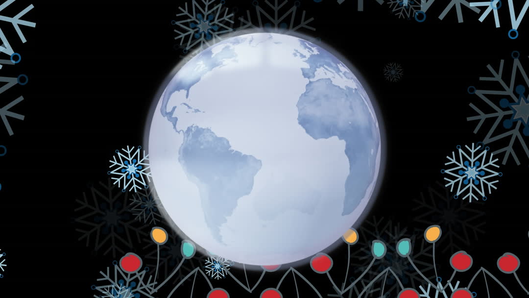 Animated visual depicting a serene winter scene with a globe surrounded by falling snowflakes and decorative holiday lights. Suitable for holiday greetings, festive presentations, or as a charming, animated background for seasonal events. Invokes a traditional holiday atmosphere with modern digital elements.