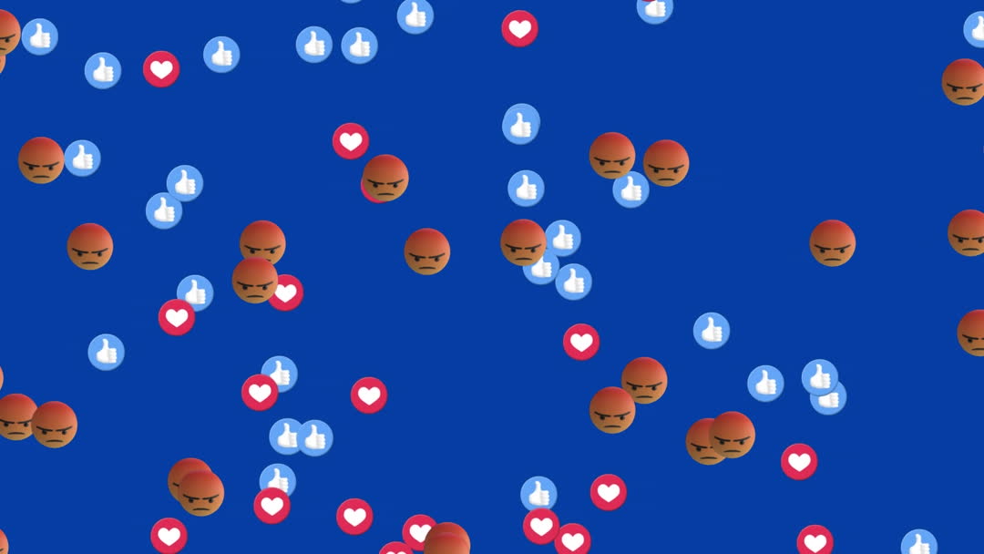 Animation features various social media icons such as heart reactions, thumbs up, and angry emojis against a blue backdrop. Useful for illustrating concepts related to digital communication, social media interaction, and online engagement, ideal for video productions, marketing presentations, or web design to emphasize modern digital dialogues.