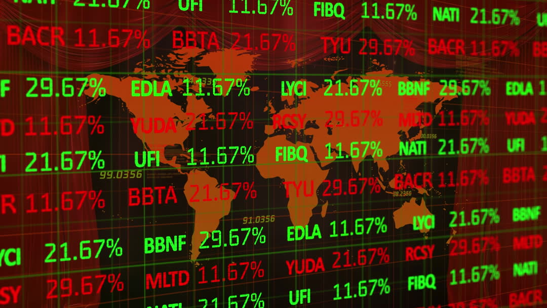 Colorful stock market numbers in red and green dynamically pop overlaid on a world map backdrop. Crafted depicting global economic activities for use in financial analysis, business presentations, or accessing market trends. Ideal for channels or graphics exploring investment strategies or showcasing introductory sections about business growth patterns.