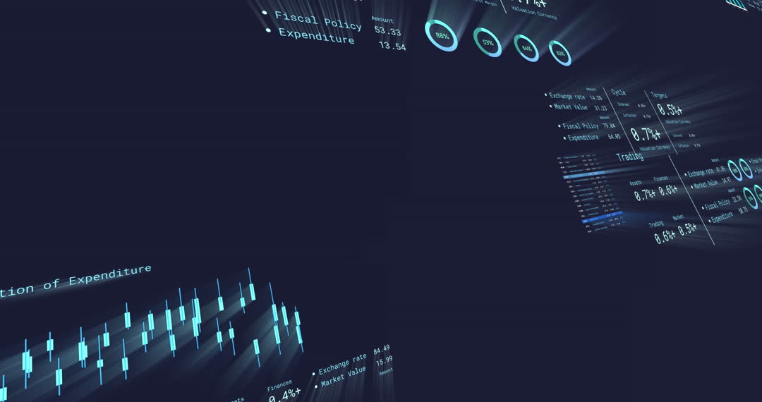 Depicts animated financial data including charts and figures, emphasizing trading and stock market themes. It provides a futuristic view of financial analysis and technology-centric stock representation. Suitable for use in financial presentations, investment-related content, or websites focusing on economic technology solutions.