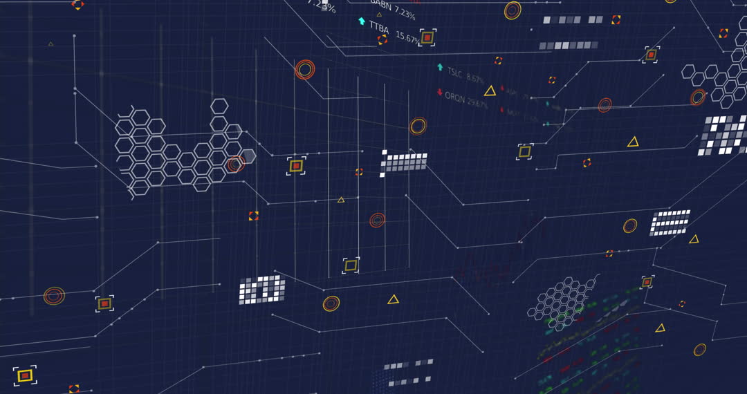This visual represents stock market data processing as a digital animation against a blue backdrop, illustrating concepts of the global economy and modern business technology. Ideal for use in finance-related brochures, educational materials on data analysis, or tech-savvy business presentations.