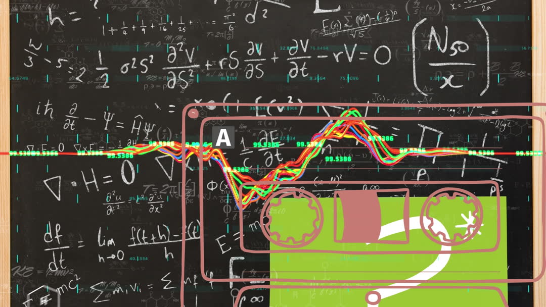 Animation combines retro tape icon and complex mathematical equations on blackboard. Suitable for illustrating digital education concepts, educational content creation, mathematical studies, and abstract teaching materials.