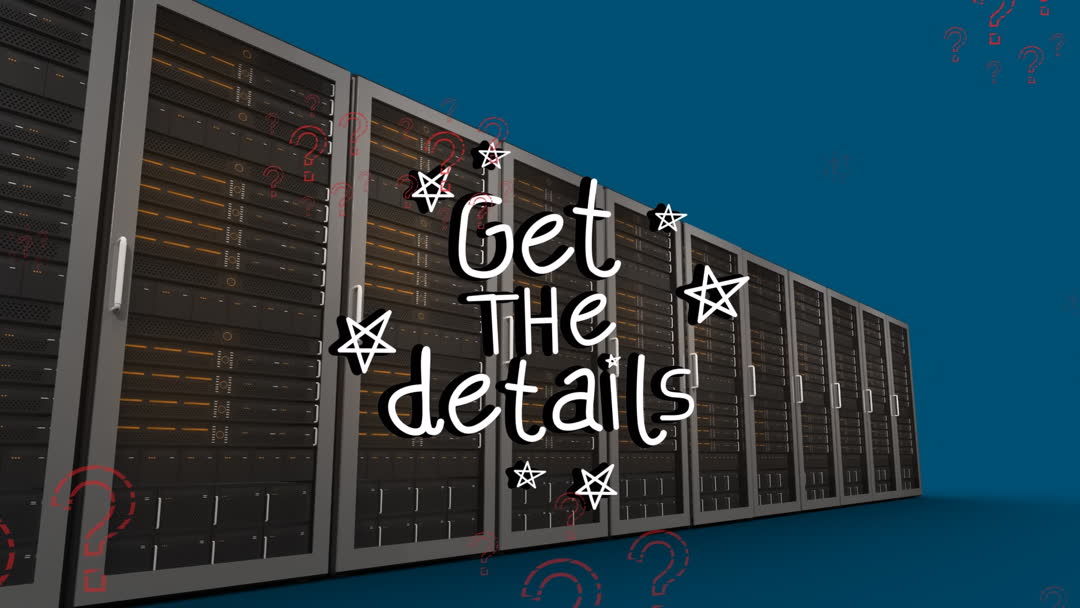 Animation showcasing the phrase 'Get the details' over a series of large data servers. Depicts global business and data processing concepts, ideal for presentations or digital visuals related to technology, IT, and data management.