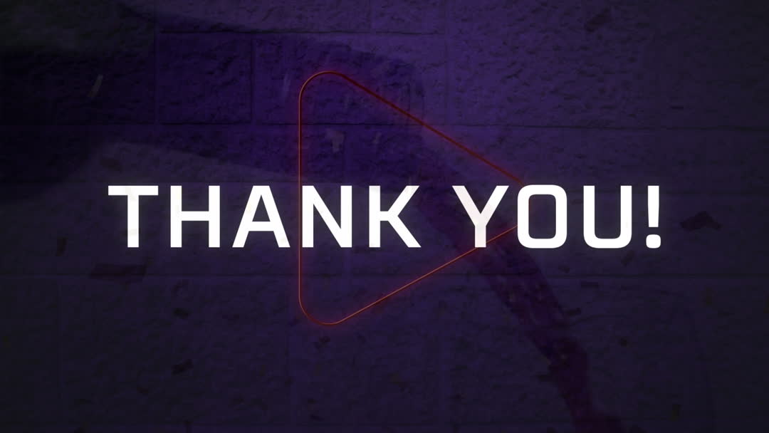 Thank you text is illuminated with an overlay of a red neon play icon against a textured brick wall. The combination of digital elements and ambient lighting creates a modern vibe, perfect for expressing gratitude in an online community or social media contents. Suitable for use in technology presentations or digital marketing material.