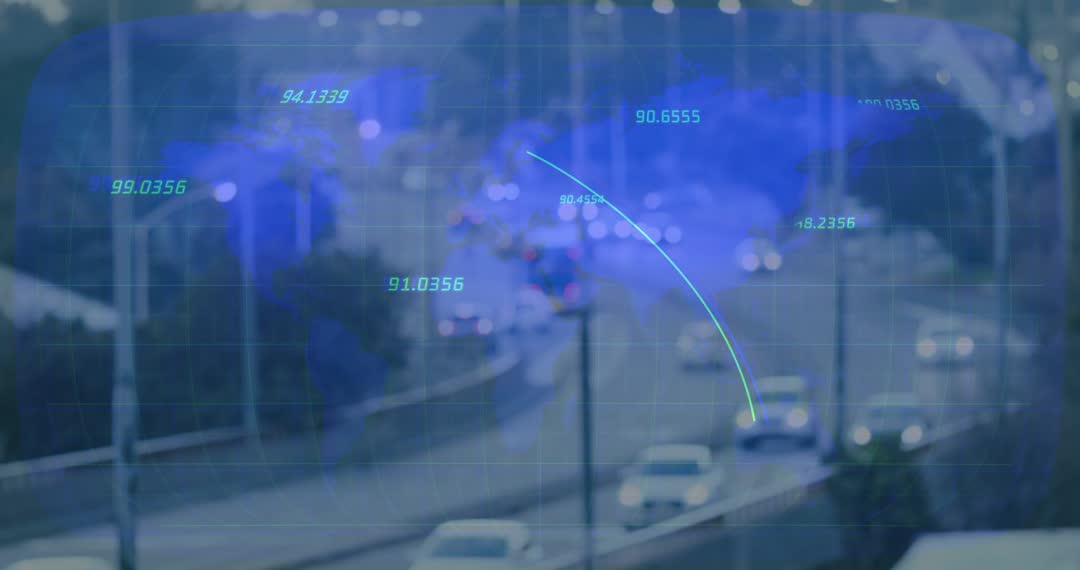 Video showing animated traffic flow overlaying highway corridor, featuring cyan trajectory arcs, numeric labels, grid overlay, and subtle world map heatmap. Foreground vehicles moving along curved lanes with motion blur, analytics data points floating across frame to indicate speed, position, and telemetry. Color palette using cool blues and cyan accents to emphasize data-driven visualization and futuristic UI feel. Suitable for traffic management presentations, smart city dashboards, transportation analytics demos, urban planning reports, safety and insurance briefings, and technology conference openers. Usage suggestions: use as loopable background for dashboard mockups; incorporate into explainer videos demonstrating vehicle tracking or fleet optimization; employ in marketing materials for telematics, intelligent transport systems, or predictive traffic solutions. Delivering clear visual of vehicle trajectories and numeric telemetry, helping audiences understand routing patterns, congestion hotspots, and predictive modeling. Recommended formats: high-resolution MP4, loopable 10-30 second clips, optional alpha channel for overlay compositing.