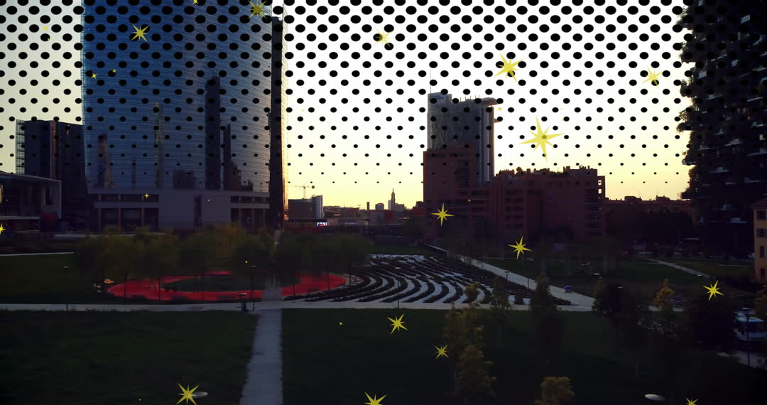 Video shows a cityscape at sunset, animated with a pattern of falling stars and dots. Ideal for topics related to urban life, creativity, social media innovation, and communication themes in digital design. Useful for marketing campaigns, presentations, or background visuals for social media content focusing on modern city themes.