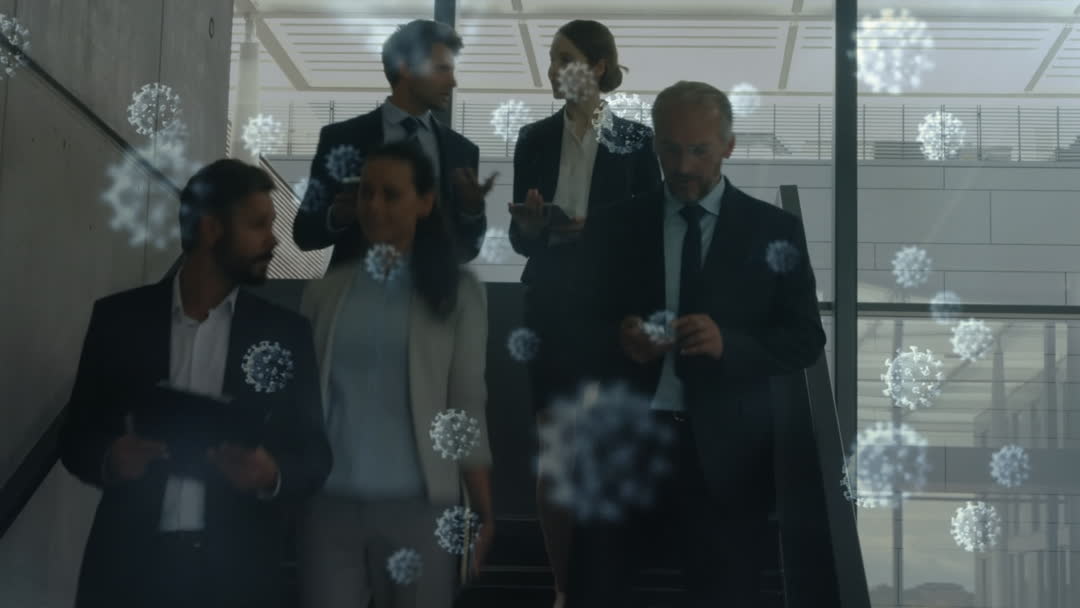 Businesspeople in professional attire walking in an office while digitally animated virus particles float around. Represents impact of Covid-19 pandemic on workplace environment. Ideal for media exploring how businesses adapt during pandemics, health and safety measures in corporate spaces, or technological integration during crises.