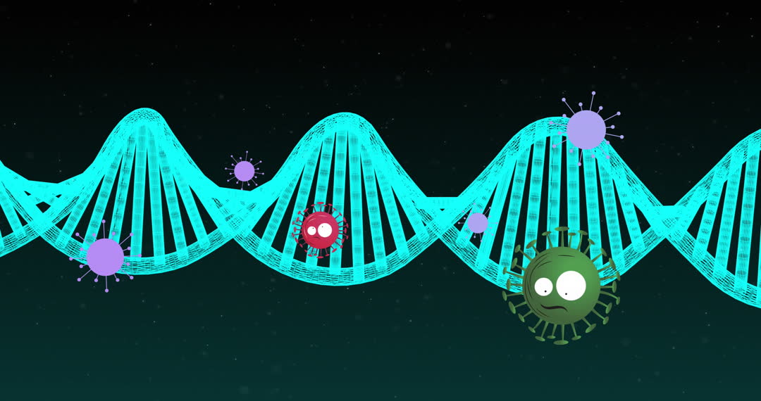 Visual depicts animated virus cells interacting with a glowing DNA strand, emphasizing digital concepts in global science and healthcare. Useful for illustrating topics in genetics, microbiology, disease research, and educational content about virology.