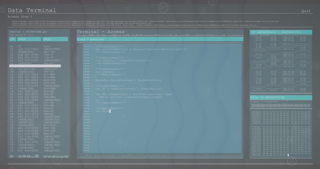 Animated video showcasing digital waves overlaying a terminal display filled with code. Represents data processing, global connections, and computing technology. Useful for illustrating concepts in programming, cybersecurity, or digital interfaces.