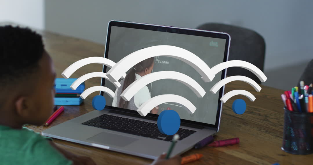 Visual depicts digital connectivity and modern technology with animated wifi icons overlaying a laptop screen. Suitable for representations of online learning, remote work, and digital connectivity themes, highlighting advances in telecommunications and the seamless integration of technology in everyday life.