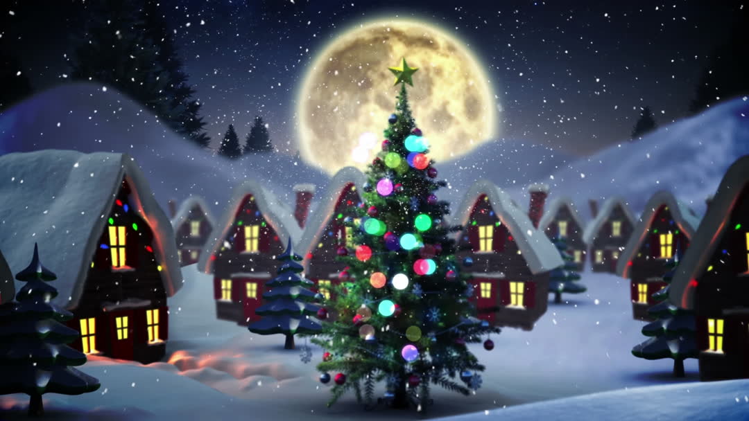 Digital animation showcasing Santa Claus riding his sleigh pulled by reindeer under a snowy, moonlit sky in a charming winter village. It features a vibrant, ornament-filled Christmas tree, idyllic snow-dusted homes, and a serene Yule ambiance. Perfect for holiday greeting ecards, festive social media headers, and creative Christmas marketing themes.