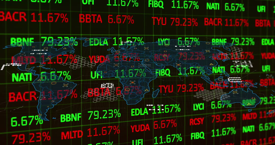 Abstract visualization of global financial data overlaying a digital world map with red and green stock indicators. This design captures attention with its dynamic representation of economy and business trends. Ideal for use in articles, presentations, or videos depicting global financial markets, technology interfaces, or digital data processing.