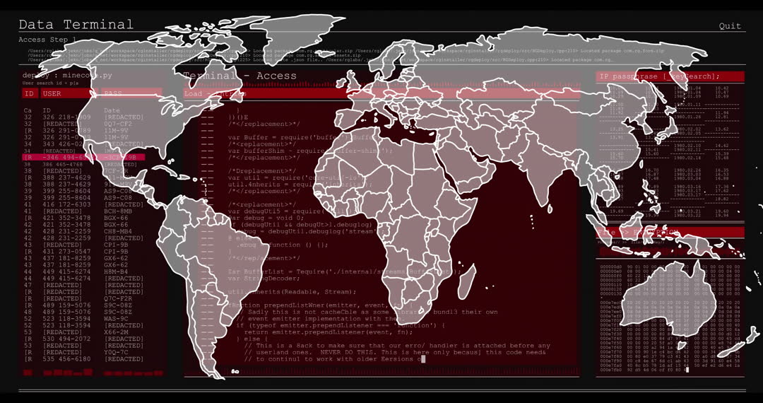 Depicts animated world map overlaid on digital data visuals, highlighting global technology and data processing. Ideal for content on cybersecurity, global business, IT sectors, and digital innovation projects.