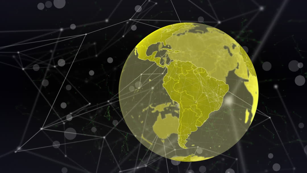 The video illustrates a concept of global connectivity with a focus on South America and highlighted network points. Perfect for use in presentations focused on technology, global business strategies, or telecommunication industries. The digital design could be used to emphasize international reach or to visually enhance themes around global finances and networking.