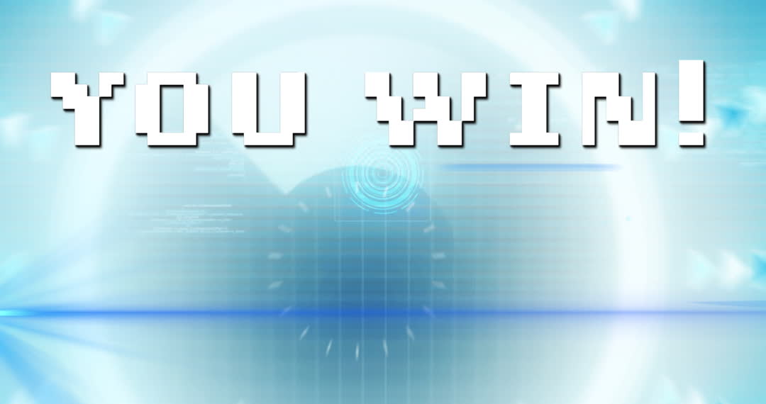 Animated 'You Win' text overlaying a futuristic digital background illustrates success or winning. Ideal for celebrating accomplishments in tech presentations, gaming videos, or digital achievements.