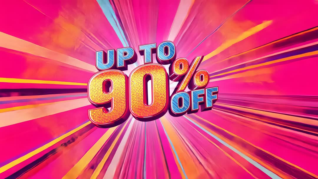 AI Generated Image. Showcasing 3D "UP TO 90% OFF" typography exploding from center, pulsing with neon colors and dynamic radial streaks and glowing flare. Graphic delivering high-energy, attention-grabbing motion ideal for short promo spots and looping backgrounds. Perfect for online retail ads, social media promos, broadcast commercials, in-store digital signage, website hero banners, email marketing headers, seasonal clearance events and holiday campaigns. Providing versatile source for 30s and 15s edit cuts, allowing copy swap for custom discount values and brand messages. Suggesting use of upbeat music, punchy sound design and fast cuts to maximize impact. Advising slight color grade adjustments to match brand palette and exporting loopable MP4 or animated PNG for seamless playback.