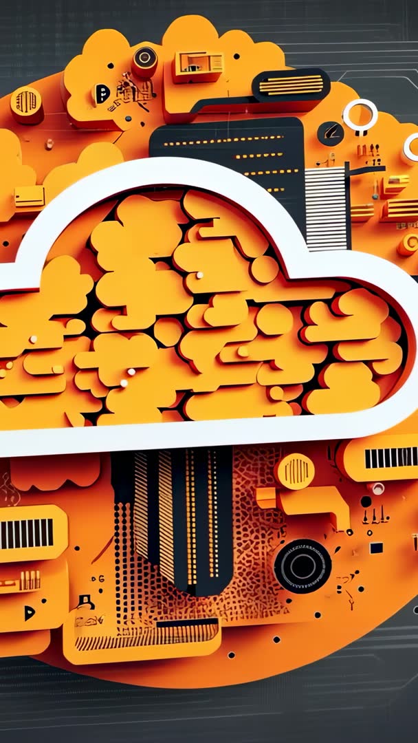 AI Generated Video. Showing vertical opener featuring stylized cloud icon formed from layered orange modules, shifting and pulsing as data is flowing along circuit-like pathways. Presenting dark circuit board background with moving traces and glowing nodes, creating futuristic high-tech atmosphere and strong depth. Revealing close-up module motion, subtle shadows, and smooth camera parallax for polished 3D look. Ideal for use as intro or background for cloud computing, SaaS product, data security, or IT services messaging. Working well as hero loop for website header, social media vertical ad, mobile app splash screen, trade show display, or explainer video. Pairing with bold text overlays, logo reveal, or voiceover for storytelling about cloud migration, ransomware protection, analytics, or digital transformation. Suggesting edits for brand color swap, text-safe layout, and seamless loop points for continuous playback.