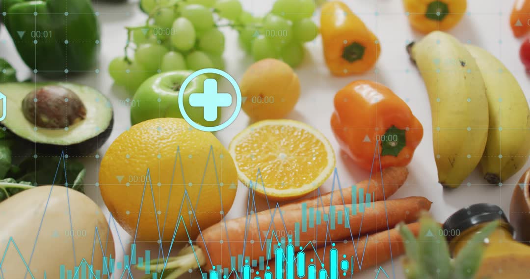 Rich display featuring assortment of fresh fruits and vegetables overlaid with animated data graphics and icons. Illustrates intersection of health, wellness, and technology with visual appeal. Suitable for marketing nutritional products, educational content about healthy lifestyle benefits, applying infographic design or animations for conveying sector trends in organic produce or wellbeing databases.