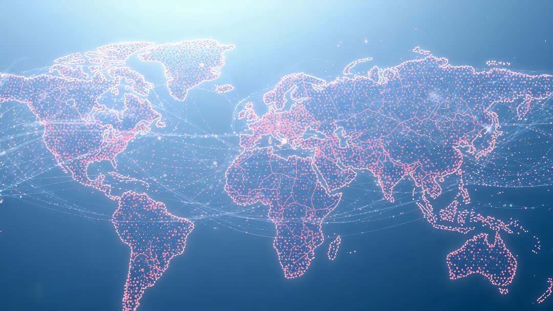 AI Generated Image. Video clip showing dotted continental outlines glowing on deep blue background while flowing arcs are connecting major regions and streaming data between nodes. Motion graphics style with soft glow, pastel pink nodes and subtle lens haze creating futuristic yet elegant look. Usage ideas: using for corporate technology presentations, telecom and cloud service promos, cybersecurity or analytics explainer videos, website hero banners, broadcast openers, investor pitch decks, event stage backdrops. Looping friendly for long-form screens and trade show displays. Customization tips: overlaying logo and headline on upper left or center-right, recoloring nodes to match brand palette, adjusting playback speed for dramatic or subtle effect, adding animated pins or data labels to highlight routes. Suitable for editorial visuals, social media promos, app intros, training modules and investor relations content.