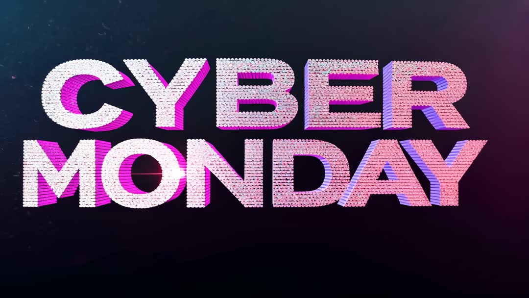 - Animating faceted Cyber Monday 3D neon text with glowing sweep and spark burst promo
