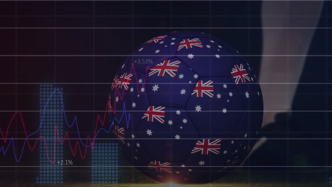 Football adorned with Australian flag represents pressing action while animated graph rises in visual metrics display. It combines Australia's pride with movement of football, suggesting sports analytics and competition-ready performance. Conceivable as promotional medium for sports clubs, data analysis, or analytic challenges in upcoming tournaments. Engaging as background visual for sports audios or tutorials aiming to blend fervor with incisive examination tools.