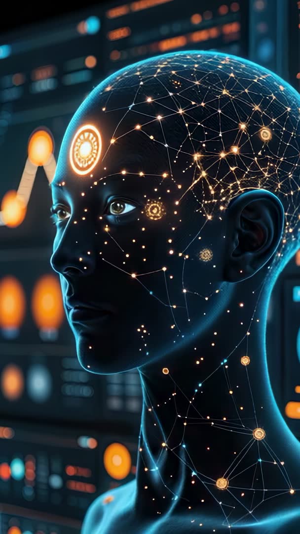 AI Generated Image. Vertical video showing humanoid AI head with glowing network nodes pulsing across skull and neck, overlaying dynamic analytics dashboard and charts in background. Neural connections forming and transmitting light, suggesting dataflow, machine learning processing, and cybersecurity monitoring. Composition featuring teal and orange highlights, shallow depth for cinematic focus, and animated HUD elements for real-time analytics feel. Use for tech presentations, corporate AI demos, cybersecurity campaigns, product launch reels, mobile ads, app intros, and keynote backdrops. Recommend loopable clip for social vertical platforms, adding lower third for branding, and pairing with data-driven voiceover or motion graphics captions to emphasize metrics.