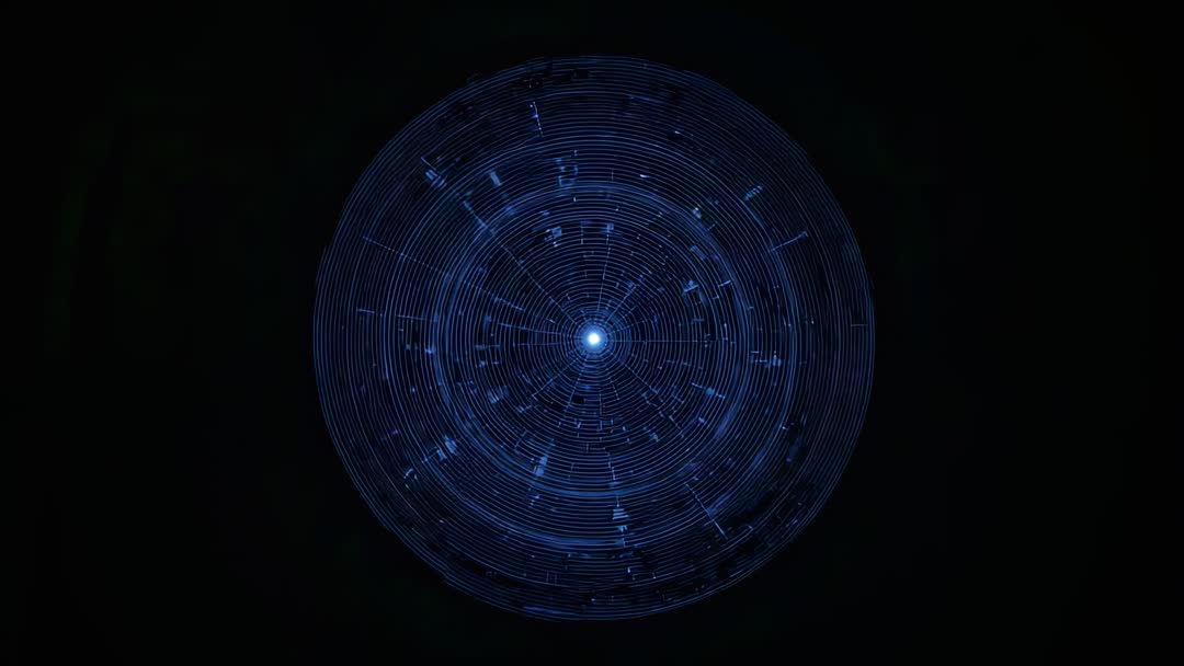 - Animating neon concentric data rings with pulsing blue core and holographic particles