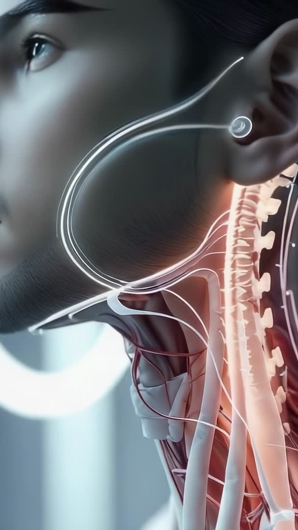 AI Generated Image. Video showing animated neural overlay responding to pulsing ear module on Asian woman in lab. Animation highlighting nerve pathways along neck and cervical spine while ear device pulsing indicates neural activation. Visual style combining biomedical illustration with sleek tech aesthetics for clean clinical look and high-contrast anatomical detail. Use cases: - Presenting neuroscience research findings during conference talks and webinars - Enhancing startup pitch decks and investor demos for neurotech or wearable health devices - Creating vertical social media ads and short-form content for TikTok or Instagram Reels - Supporting clinician training modules and patient education materials - Illustrating journal supplements, explainer videos, and website hero clips for medical technology brands Motion, color grading, and anatomy overlays allowing seamless integration into longer medical animations or product demo reels. File offering fast visual communication of neurostimulation concepts, vagus nerve modulation, and next-generation wearable interface innovation.