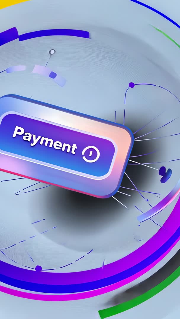 AI Generated Video. Featuring rotating rings circling payment button on grey concave disc with clock icon, creating dynamic sense of motion and urgency. Using glossy 3D gradient finish with purple and blue highlights and subtle shadows for depth. Offering smooth loopable animation optimized for vertical video and mobile screens. Serving as mobile payment promo, fintech app intro, onboarding animation, app store preview, social media vertical ad, landing page hero, or UI demo. Allowing easy color and speed customization to match brand identity and campaign tone. Delivering modern clean aesthetic for finance, ecommerce, payment processing, digital wallet, and tech marketing projects.