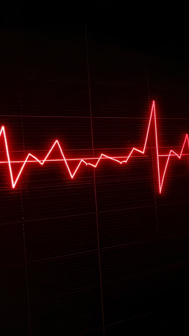 AI Generated Image. Animating neon red ECG trace shifting left across dark grid after sudden spike, creating dramatic glowing pulse effect. Featuring sharp peak and jagged waveform for high-energy cardiology and emergency visuals. Serving as loopable motion background for vertical formats like mobile stories, social reels, and app intros. Enhancing medical presentations, training modules, device demos, and news graphics by adding emphasis to heart rate, alarm, or monitoring topics. Pairing well with bold typography, data overlays, and color grading for branding, broadcast lower thirds, or social campaign thumbnails.
