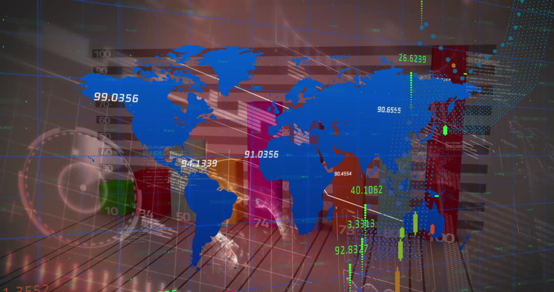 Animation showing intricate financial statistics and analytics dwindling over a world map backdrop. Complex data visualization engaging in key trends forecasts gives a compelling modern futuristic feeling once portraying essential of world's trade questing into tangible progress. Leveraged effectively for presentations in industries hooked with Global finance agenda anticipating data-driven factors relevant purposes.