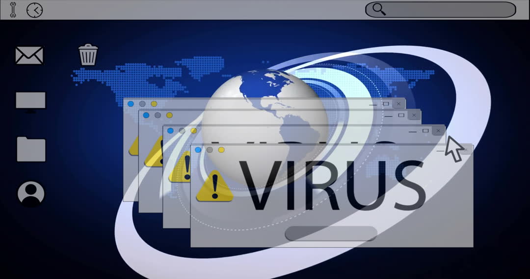 This animation shows a digital virus alert over a globe, symbolizing global cybersecurity threats and data breaches. Ideal for use in presentations, educational materials about internet security, and articles on global data protection or virus impacts.
