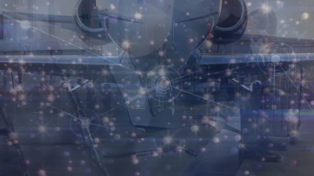 Visual represents a futuristic concept of global connectivity and network communication in the aviation industry. Features airplane overlaid with digital icons symbolizing technology integration and business operations. Suitable for illustrating topics related to international travel, digital transformation, and modern business strategies.