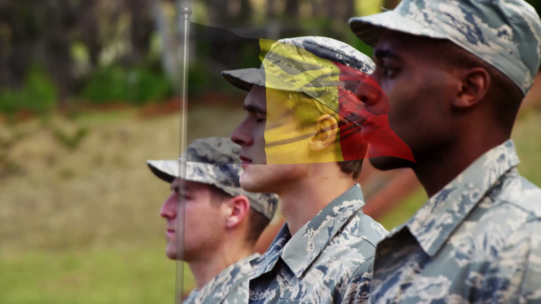 - Animation of Belgian Flag with Diverse Soldiers Saluting Outdoors