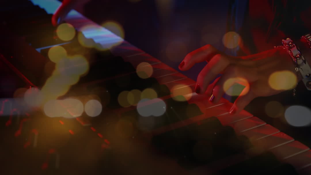 - Animation of blurred night road traffic over hands of caucasian man playing keyboard on concert