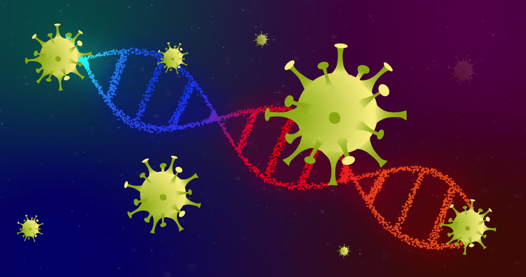 Illustration presents digital animation featuring green COVID-19 cells revolving around a vividly colored DNA strand, symbolizing the interaction between virus and genetic structures. Useful for presentations, educational materials emphasizing virus genetics, and digital health content aiming to educate about COVID-19 and related viral effects on genetic material.