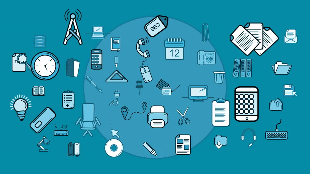 This video showcases a collection of digital icons representing technology and business themes over a blue background. It illustrates various tools associated with digital enterprises and innovation, such as communication devices, calendars, and office supplies. Useful for presentations or websites about modern technology trends, digital tools, and tech-driven businesses.