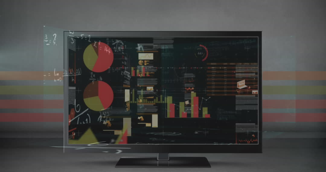 Engaging visual representation of technological themes featuring animated graphs and mathematical formulas. This video captures elements common in data analytics, educational materials, and presentations on digital technology and networks. Ideal for use in multimedia presentations, tech-related articles, or online tutorials highlighting themes of data analysis, network integration, and information processing.