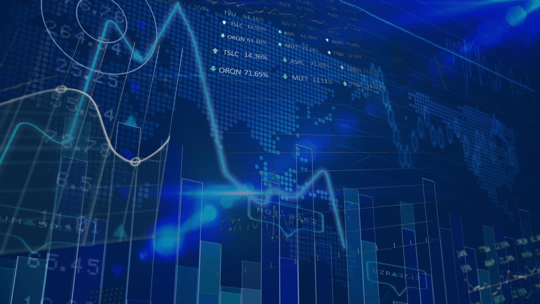 Dynamic animation featuring financial data and statistics over a world map background. Suitable for illustrating global business trends and analytics in presentations and reports. Ideal for use in topics involving finance, economics, and technology integration.