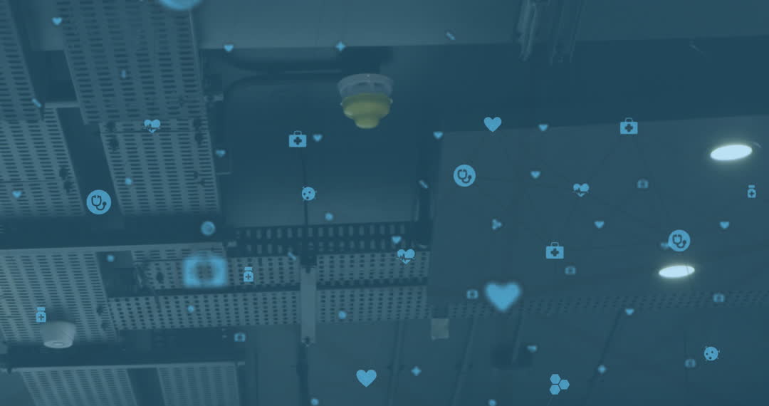 Animated overlay of medical icons displayed over office ceiling architecture, key elements in modern medical research and science technology fields. Illustrating a network concept tying healthcare, technology, and digital resources. Suitable for use in presentations about health technology innovation, medical research implications, or promotional graphics for tech companies in the medical field.