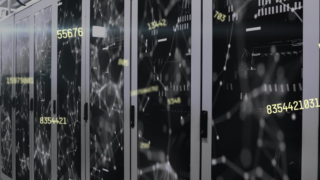 Illustrates futuristic digital environment with interconnected networks displayed over server cabinets. Could be utilized in presentations or articles about data security, technological advancements, or digital infrastructure. Useful for technology companies, cybersecurity services, and education concerning digital networks.