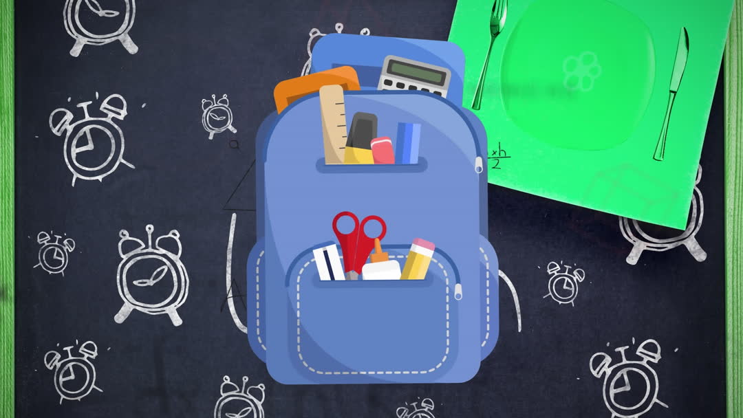 Animation depicts school bag filled with supplies like scissors, pencils, and a calculator surrounded by digital alarm clock designs. Evokes themes of education and preparation with graphical blend. Useful for content about back-to-school readiness, educational planning, or digital learning resources.