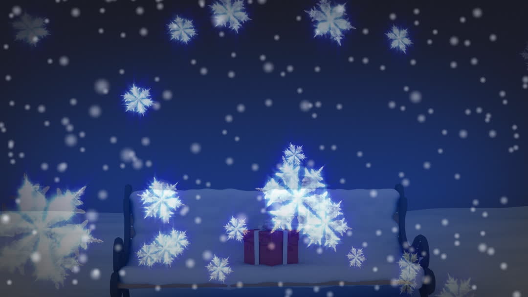 Digital animation featuring falling snowflakes over a bench with a festive present wrapped in red, creating a magical winter ambience. Perfect for use in holiday video projects, greeting cards, animated backgrounds for celebrations, and festive promotional materials.