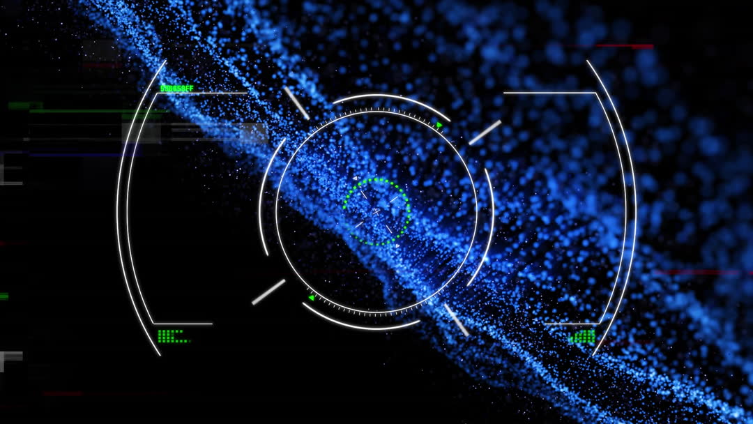 Illustrates modern technology concept with a futuristic scope scanning numerous blue particles against a black background. Ideal for use in tech presentations, digital analysis visuals, innovation-themed media projects, and sci-fi content, emphasizing critical focus and precision processes.